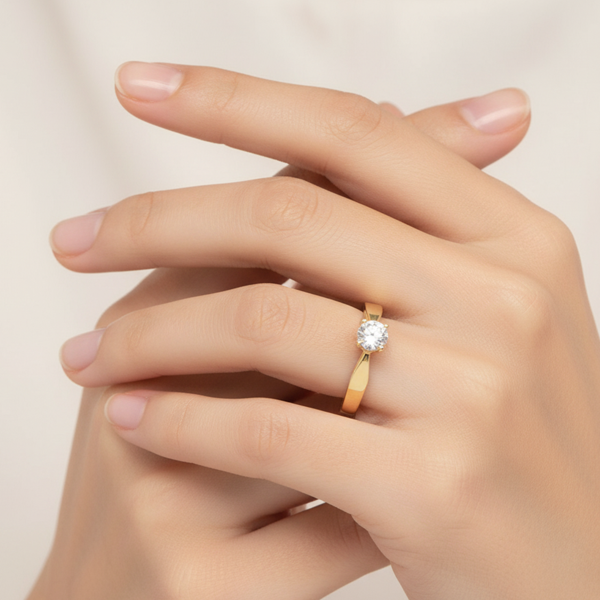 Entretien : Nettoyez régulièrement la pierre à l’aide d’un chiffon doux ou d’une brosse à poils souples avec un peu d’eau tiède et de savon doux. Évitez les produits abrasifs qui pourraient ternir l’or ou affecter la brillance du diamant.