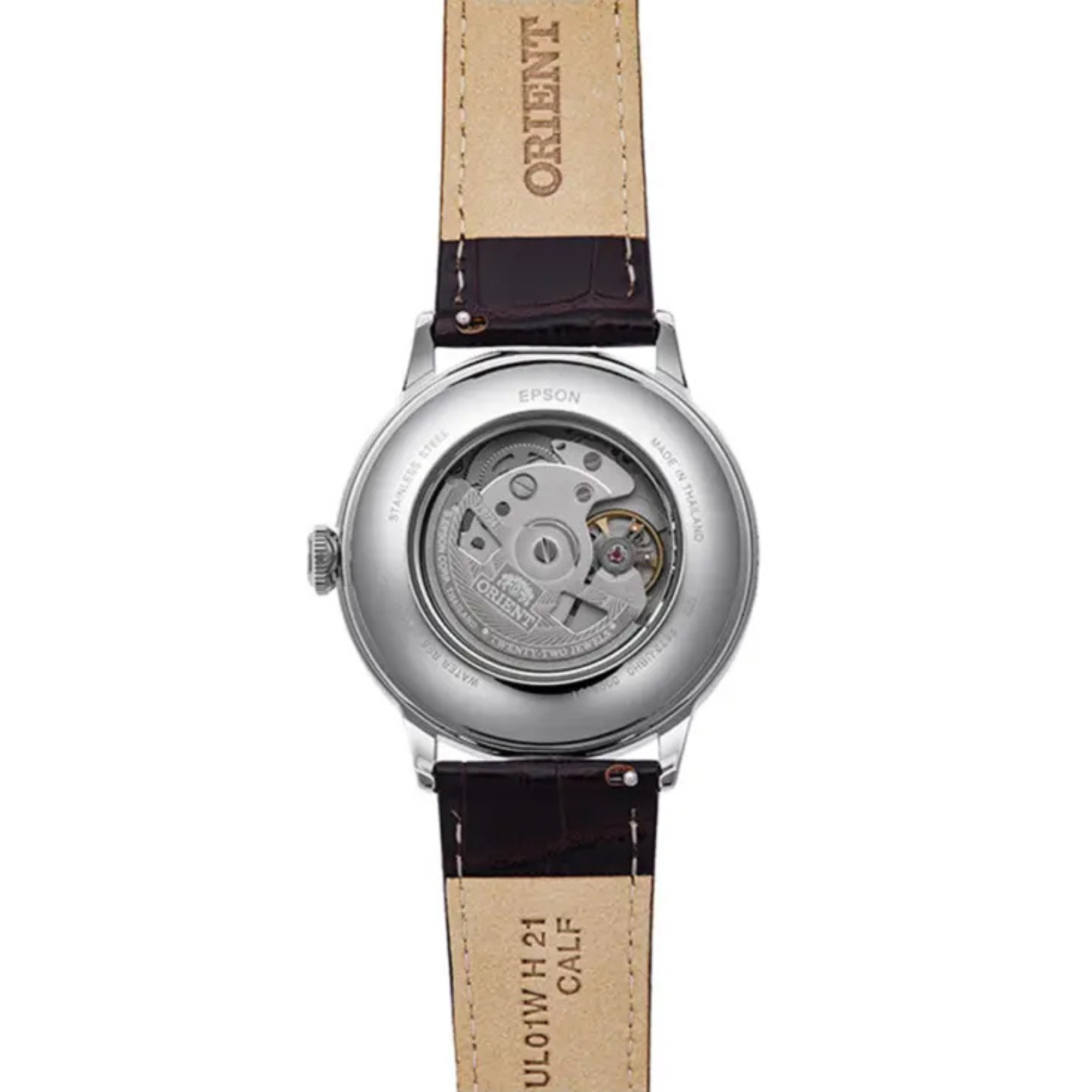Le modèle Orient présenté est une pièce horlogère raffinée et intemporelle, incarnant l’élégance classique. Le boîtier rond, d’un diamètre de 40,50 mm, est façonné en acier inoxydable, assurant une excellente résistance à la corrosion et une finition polie qui maintient son aspect au fil du temps. Le verre minéral de la montre, caractérisé par sa forme bombée, ajoute une note esthétique vintage tout en assurant une protection efficace du cadran. Un fond de montre emboîté et transparent révèle l’intérieur, permettant d’observer la complexité du mouvement mécanique en action, un point d’intérêt pour les amateurs d’horlogerie. La couronne, positionnée à trois heures, permet l’ajustement aisé de l’heure et de la date, garantissant une utilisation quotidienne fonctionnelle.