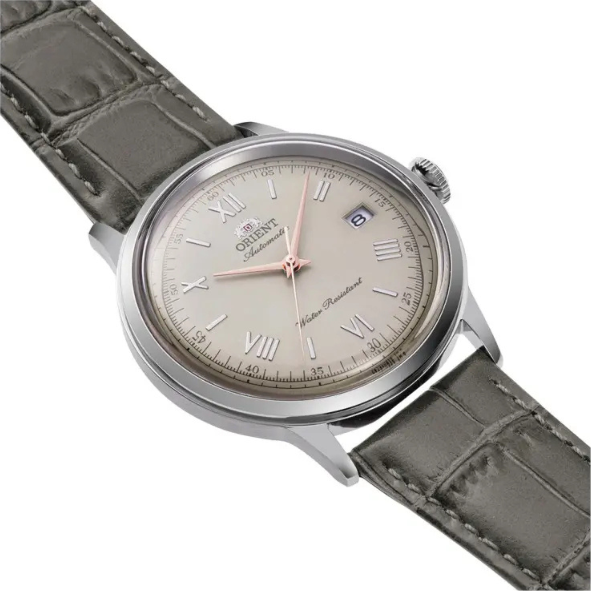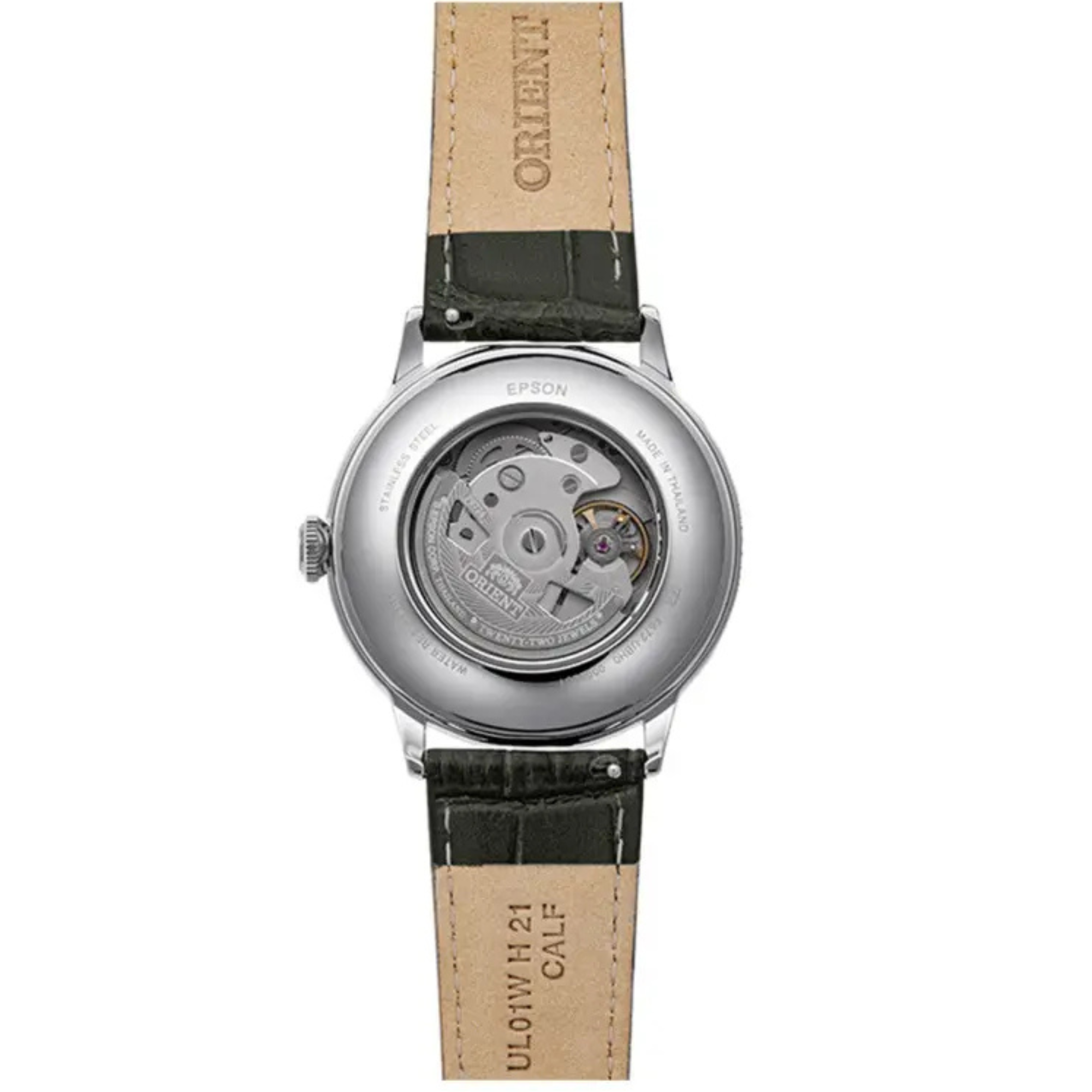 Au cœur de cette Bambino bat le calibre automatique Orient F6724. Ce mouvement de conception japonaise est reconnu pour sa fiabilité et sa précision, opérant à une fréquence de 21.600 A/h, ce qui se traduit par un déplacement harmonieux et régulier des aiguilles. Avec une réserve de marche notable de 40 heures, cette montre est conçue pour maintenir une excellente régularité sans exiger de remontage fréquent.