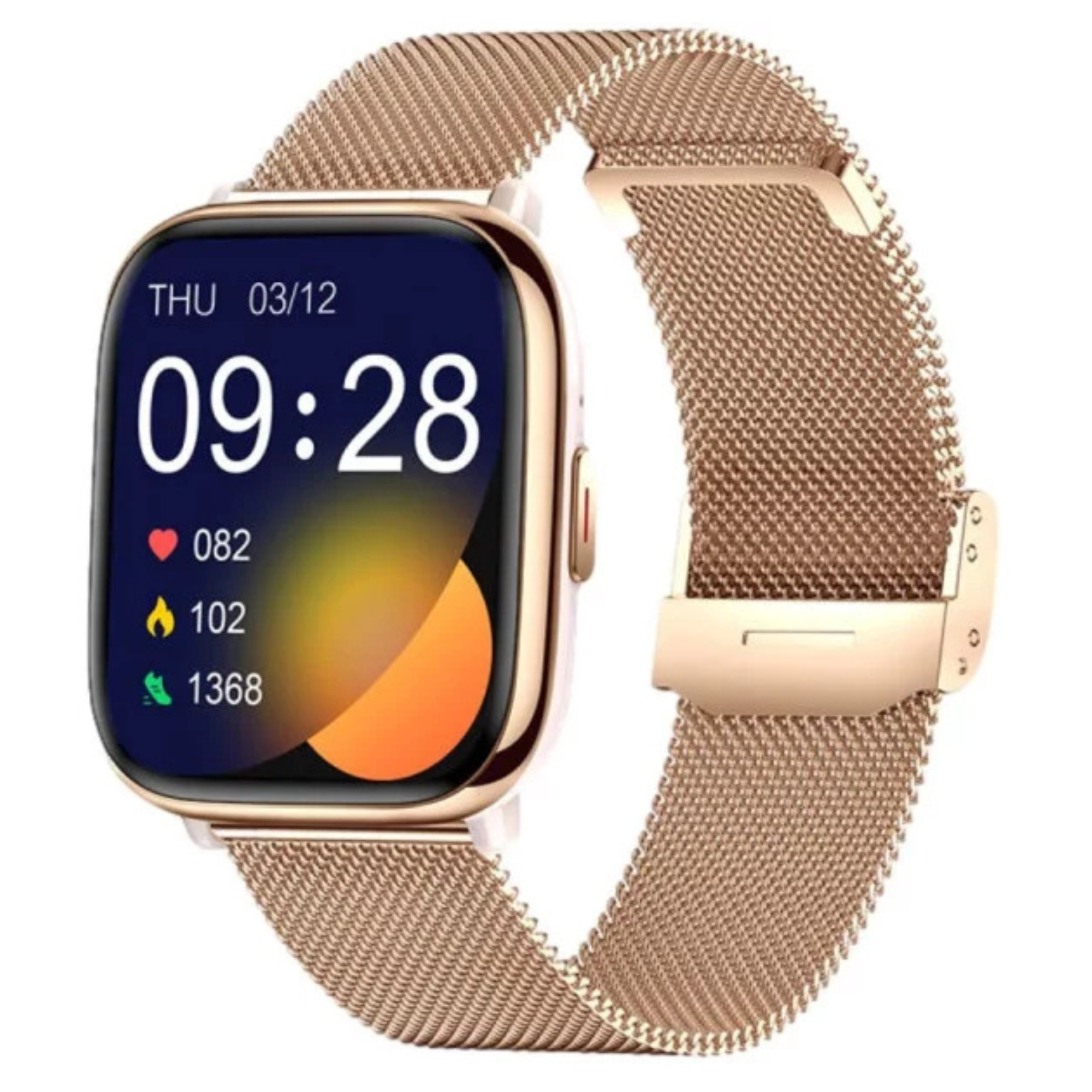 Le boîtier rectangulaire est fabriqué en alliage métallique et arbore une finition or rose, conférant un aspect raffiné et distinctif. Il est associé à un bracelet en maille milanaise de couleur assortie (Or Rose), ce qui place l’ensemble comme un véritable accessoire de joaillerie technologique.
