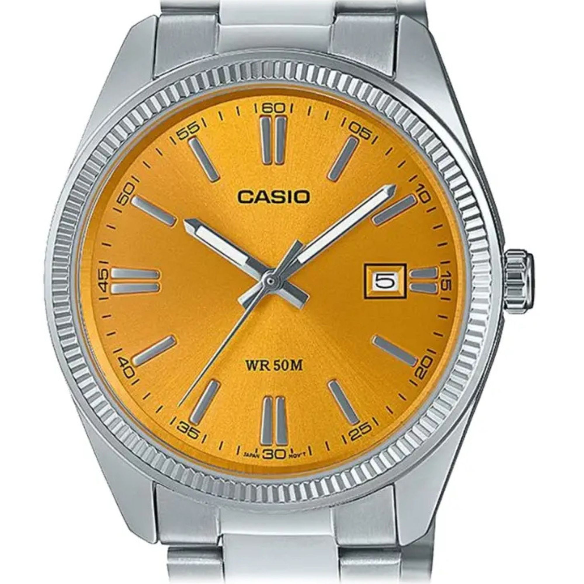 Le véritable cœur de ce modèle réside dans son cadran jaune orangé, une teinte audacieuse et ensoleillée qui apporte un « peps » immédiat à n’importe quelle tenue.